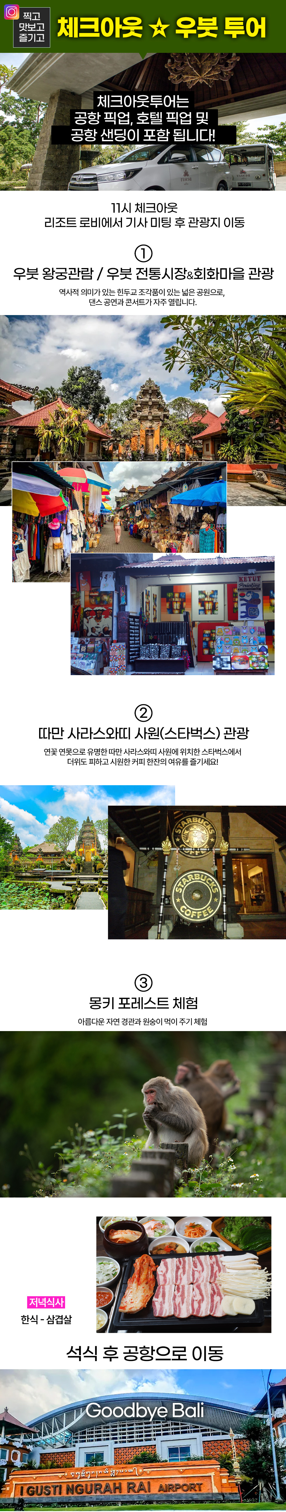 발리 도착일 공항 픽업 / 투어 호텔 픽업 / 공항 한국 샌딩 모두 포함된 상품 입니다.